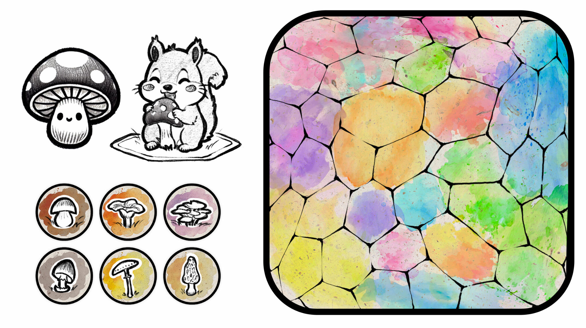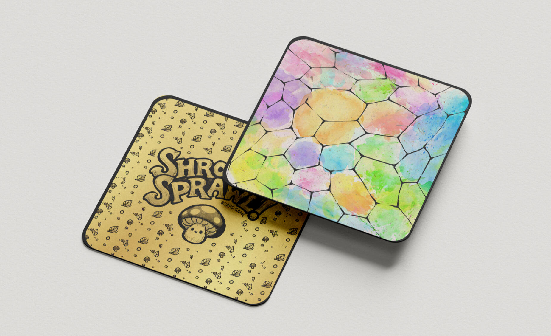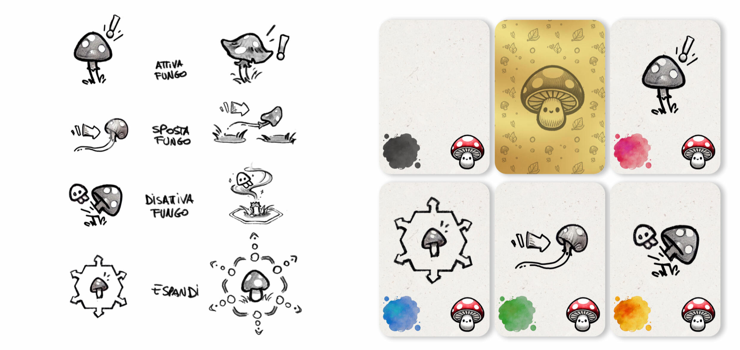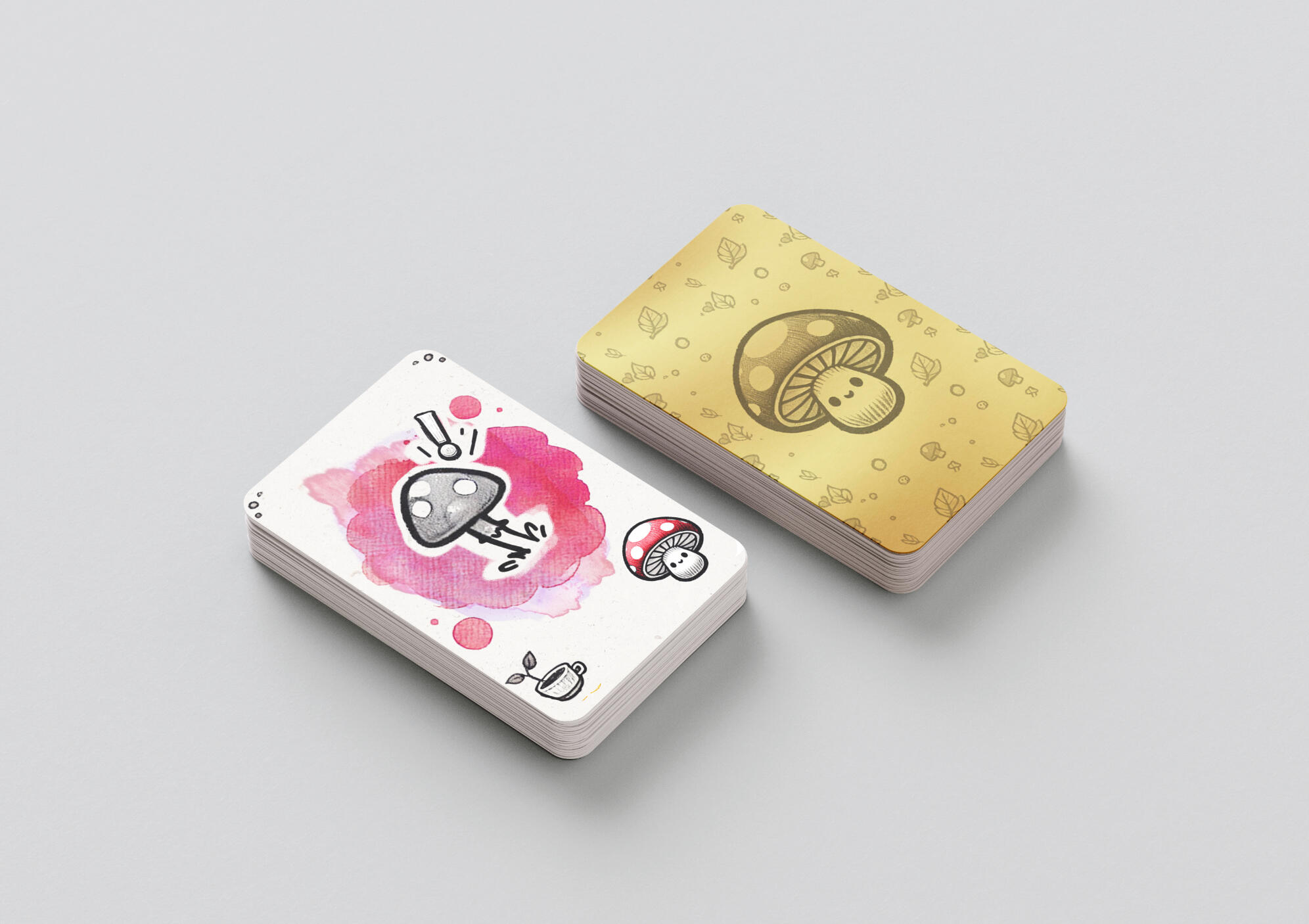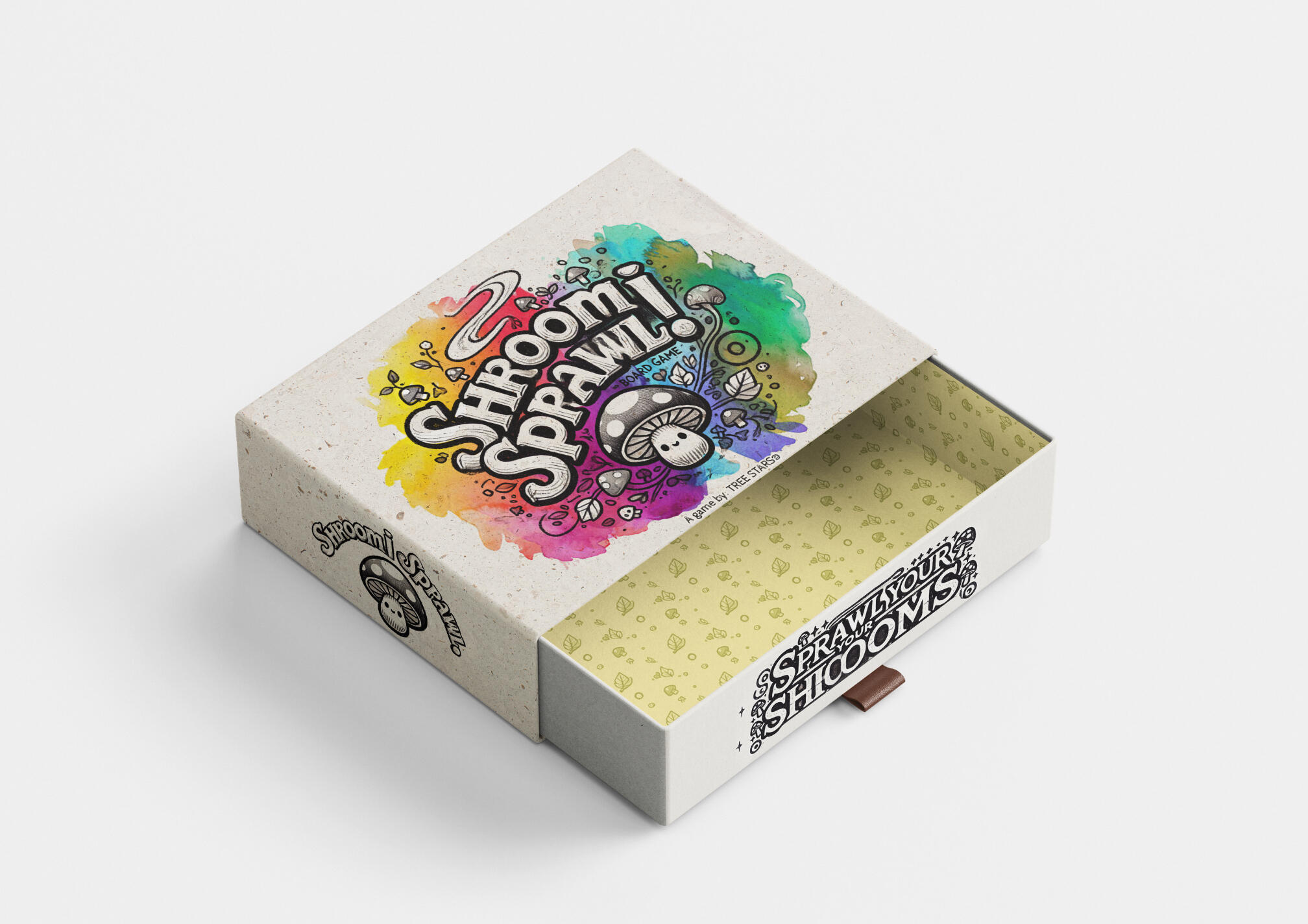Complete visual design for a family-friendly strategy game where players expand their fungal empires across the map. From the whimsical logo to the illustrated map, packaging, and action cards, every element was designed to balance clarity, charm, and gameplay flow.